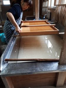 水をはった漉き舟(すきふね)に入れて漉いていきます。