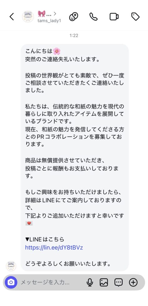 InstagramのDMを通じたPRコラボレーションの募集や、LINEへの誘導を行っておりません。